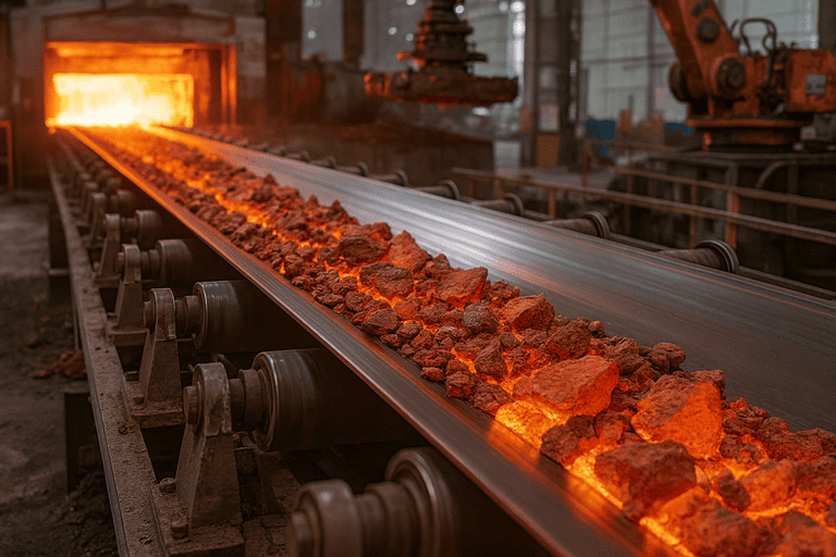 Nesses setores, a correia precisa aguentar material saindo do forno, do clínquer, do coque ou do misturador ainda quente, sem esfarelar, sem endurecer e sem rachar.